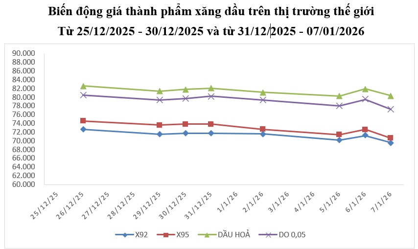 Bình quân giá thành phẩm xăng dầu thế giới giữa kỳ điều hành giá ngày 31/12/2025 và kỳ điều hành ngày 07/01/2026 là: 70,858 USD/thùng xăng RON92 dùng để pha chế xăng E5RON92 (giảm 1,095 USD/thùng); 72,180 USD/thùng xăng RON95 (giảm 1,800 USD/thùng); 81,144 USD/thùng dầu hỏa (giảm 0,749 USD/thùng); 78,850 USD/thùng dầu điêzen 0,05S (giảm 1,003 USD/thùng); 341,344 USD/tấn dầu mazut 180CST 3,5S (giảm 0,419 USD/tấn).